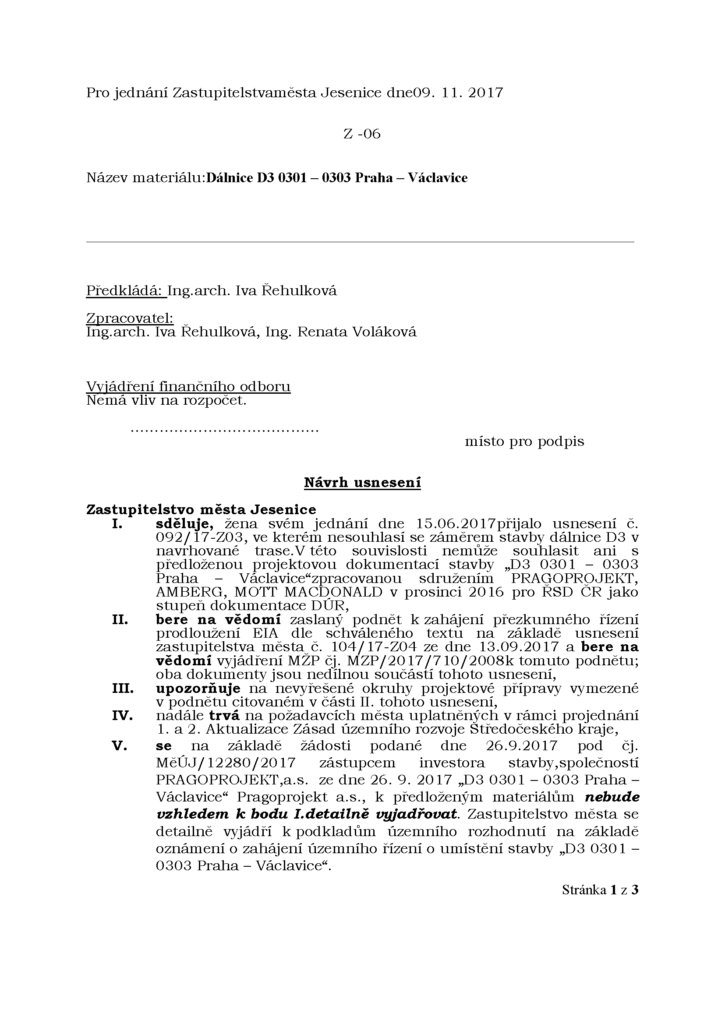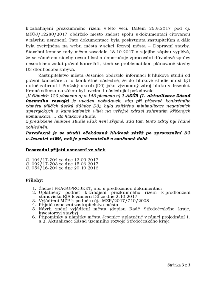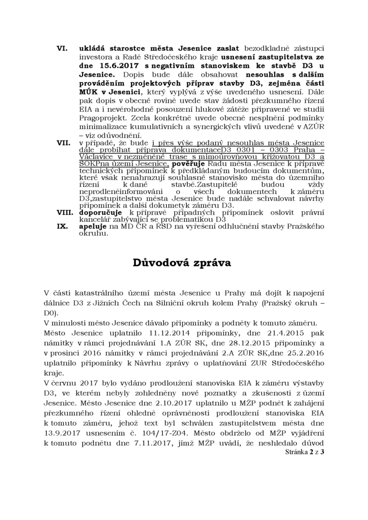 Ve čtvrtek 9. listopadu 2017 proběhlo další zasedání obce Jesenice, na kterém došlo k opětovnému odmítnutí vzniku zamýšlené dálnice D3 v její západní variantě, respektive úseku D3 0301 – 0303 Praha – Václavice. Na odmítnutí této stavby se zastupitelstvo shodlo jednomyslně napříč politickým spektrem. Přijat však nebyl návrh připravený vedením obce, ale protinávrh vypracovaný Ing. Arch. Ivou Řehulkovou a Ing. Renátou Volákovou. Zajímá vás, co přesně se ale schválilo? Odpověď naleznete níže.